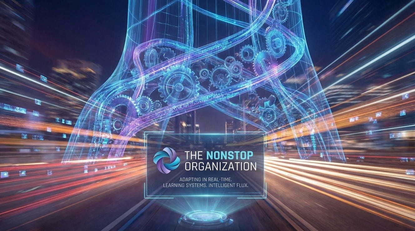 Today, with the advent of artificial intelligence technologies, a new paradigm is emerging from the collision of advanced technologies, data ubiquity, and competitive pressure. It’s the rise of The Nonstop Organization, an enterprise that evolves not through punctuated equilibrium, but through constant, intelligent flux. This is not about perpetual churn or chaos. It’s about building an organism that senses, interprets, and adapts its processes, structures, and strategies in real-time, based on what its own systems learn. The goal is no longer to reach a future “transformed” state, but to cultivate a permanent and elevated capability for adaptation.